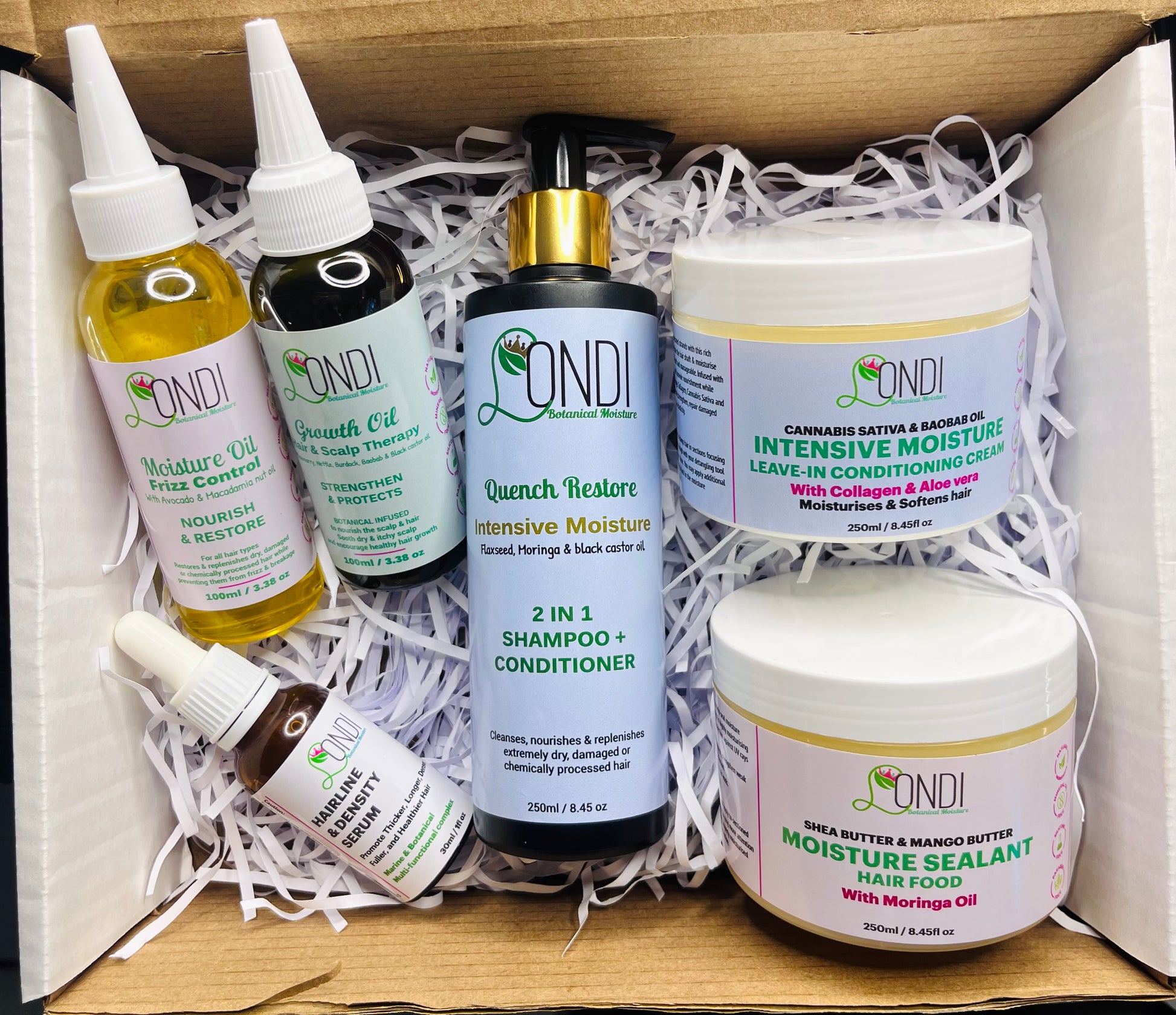 Londi Botanical Moisture complete hair set to take care of your hair concerns such as: dry hair, Dandruff, Itchy sculp, Receding hairline, hair breakage, Frizzy hair, Thin hair, etc.